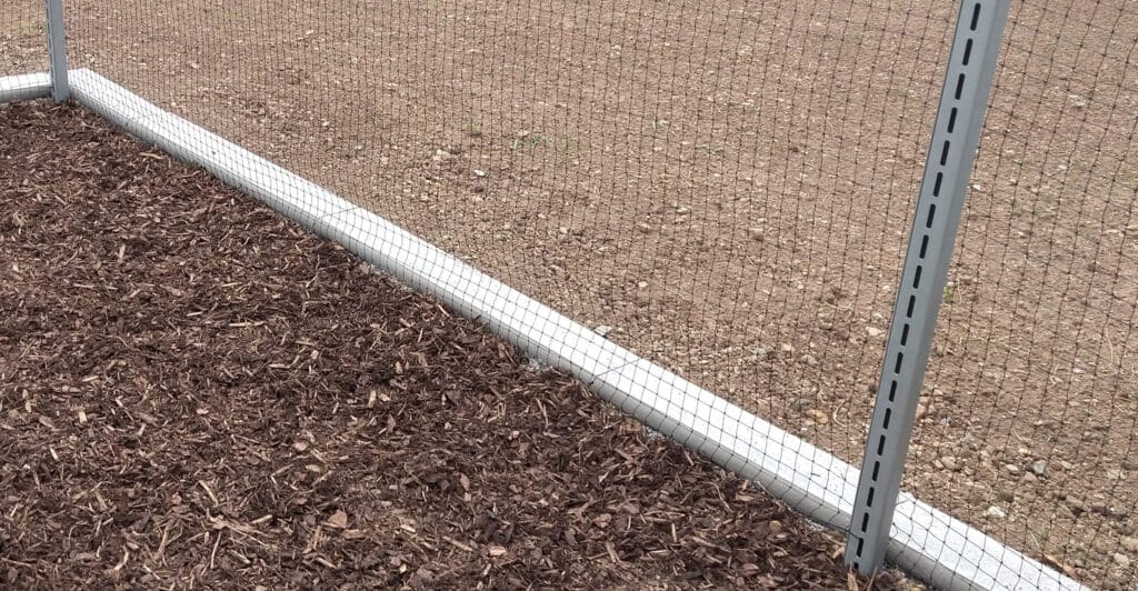 Unser System: Meine Menschen haben eine Splitt-Schicht (nur am Rand, wo das Netz aufliegt) eingebracht. Das Netz liegt fest in diesem Splittbett und wird von liegenden Rasenbordsteinen an Ort und Stelle gehalten. Das ist eine unüberwindbare Barriere! Das Buddeln stoppt am harten Stein.