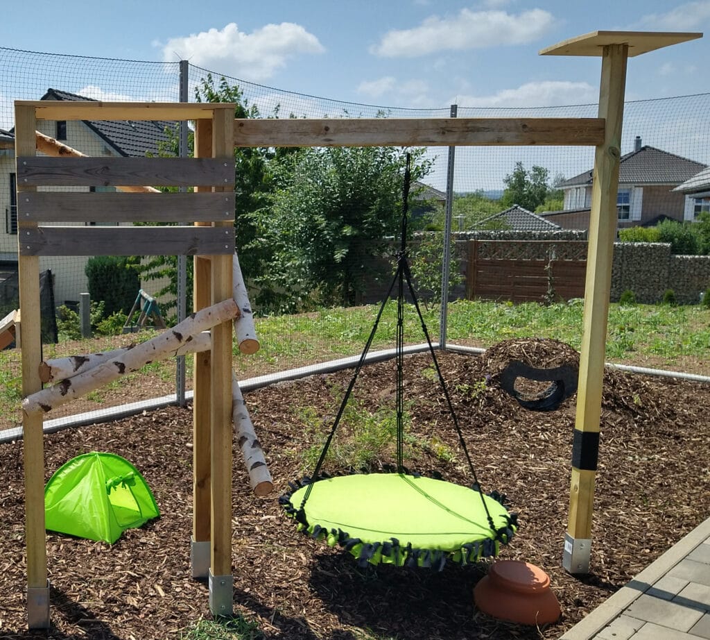 - Hängeschaukel: Am Kletterturm hängt eine große, weiche Hängeschaukel. Die Basis dafür? Ein Hula-Reifen, der mit einer alten Decke ummantelt wurde – genial einfach und stabil!