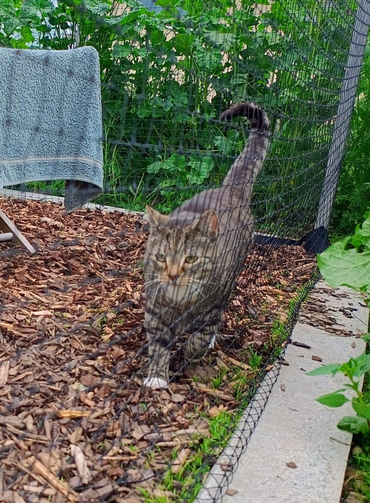 - Material-Tip: Meine Menschen haben ein sehr robustes, UV-beständiges Netz* von einem Spezialanbieter verwendet. Sie haben es mit UV-beständigen Kabelbindern* an den Pfosten befestigt.