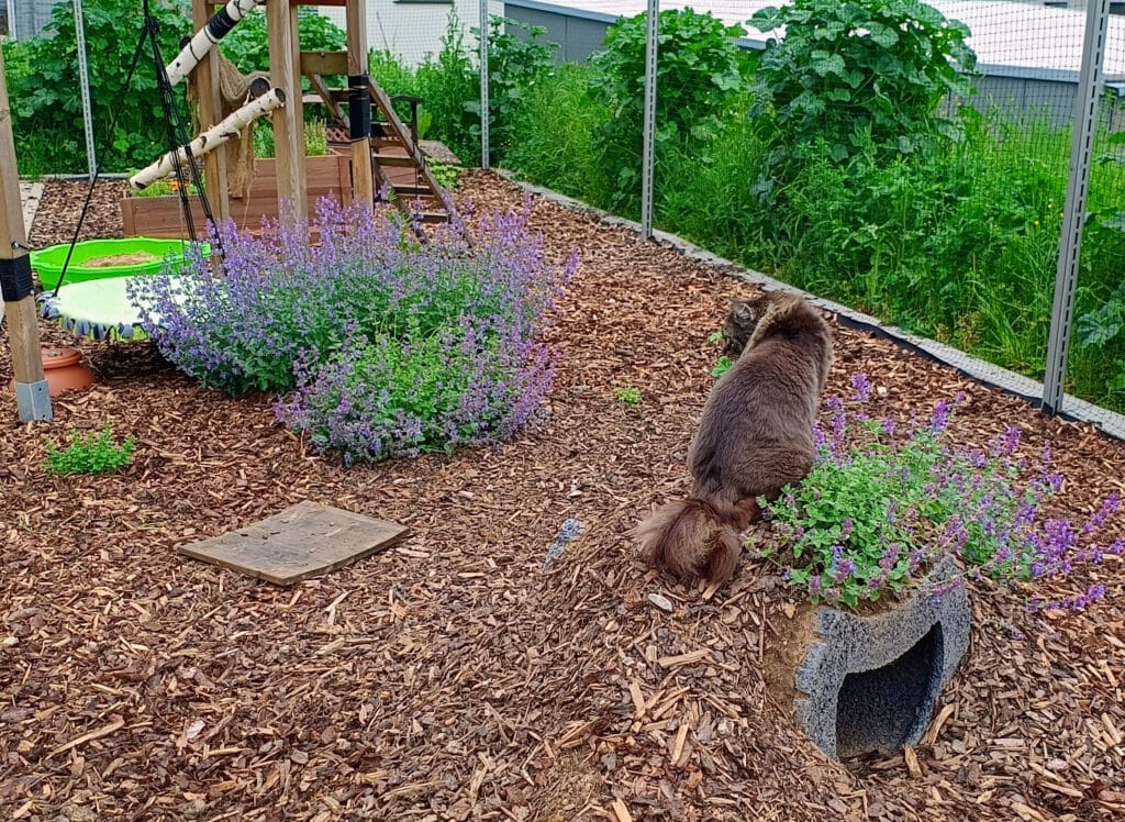 Bei uns liegt Rindenmulch* als Bodenbelag. Er sieht natürlich aus und dämpft den Aufprall. Aber Achtung, liebe Dosenöffner: Wir nutzen Rindenmulch auch gerne als großes Katzenklo! Deshalb muß er regelmäßig kontrolliert, gereinigt und vor allem nachgefüllt werden, da er mit der Zeit zu Erde wird. Bestell Dir davon am besten gleich eine größere Menge – je nach Größe des Geheges brauchst Du einige Säcke!